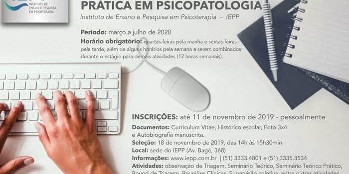 As vagas para o estágio de psicopatologia estão abertas. A inscrição é presencial e vai até o dia 11/11, e seleção ocorre dia 18/11.